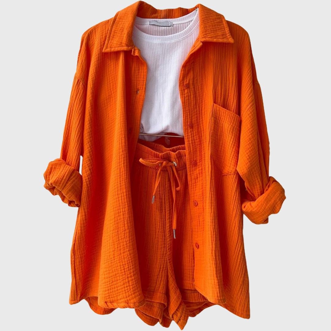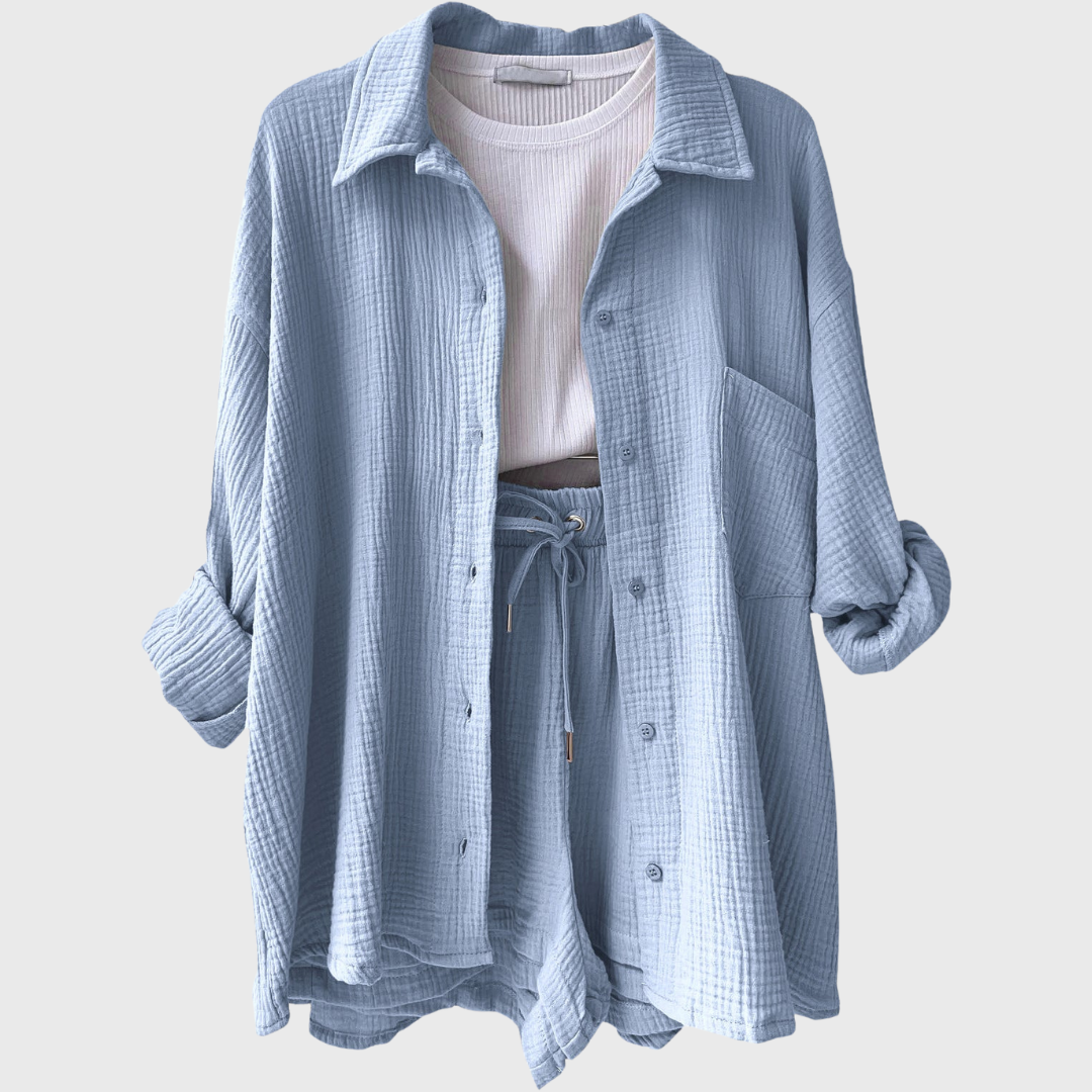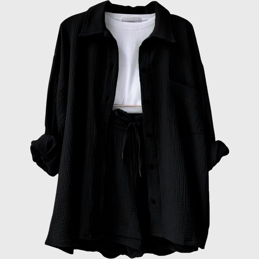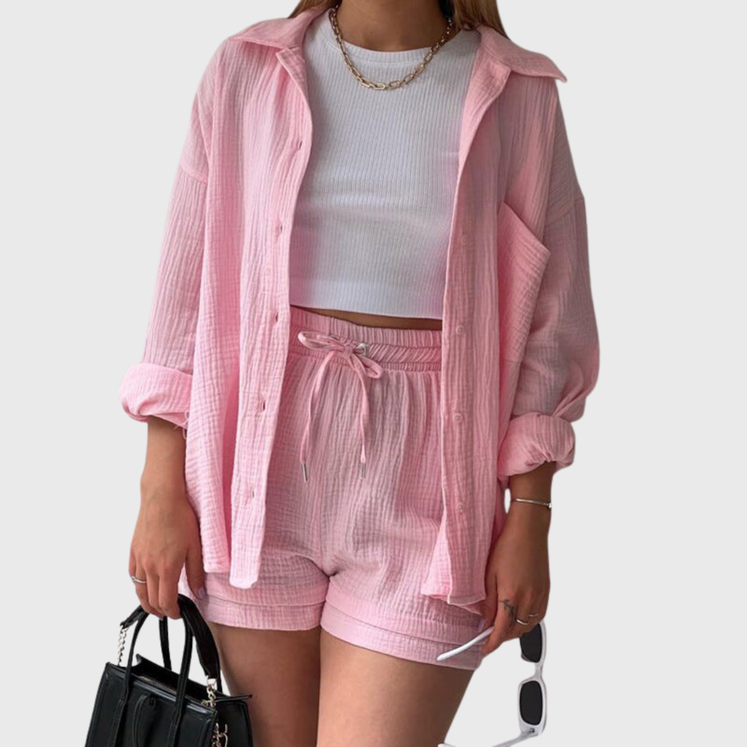 Tämä asu edustaa vaivatonta tyyliä modernilla twistillä. Löysä oversized takki ja mukavat korkeavyötäröiset shortsit luovat ilmavan, trendikkään ilmeen. Ihanteellinen kesäpäiviin, matkustamiseen tai yksinkertaisesti tyylikkäänä ja rentona liikkumiseen.